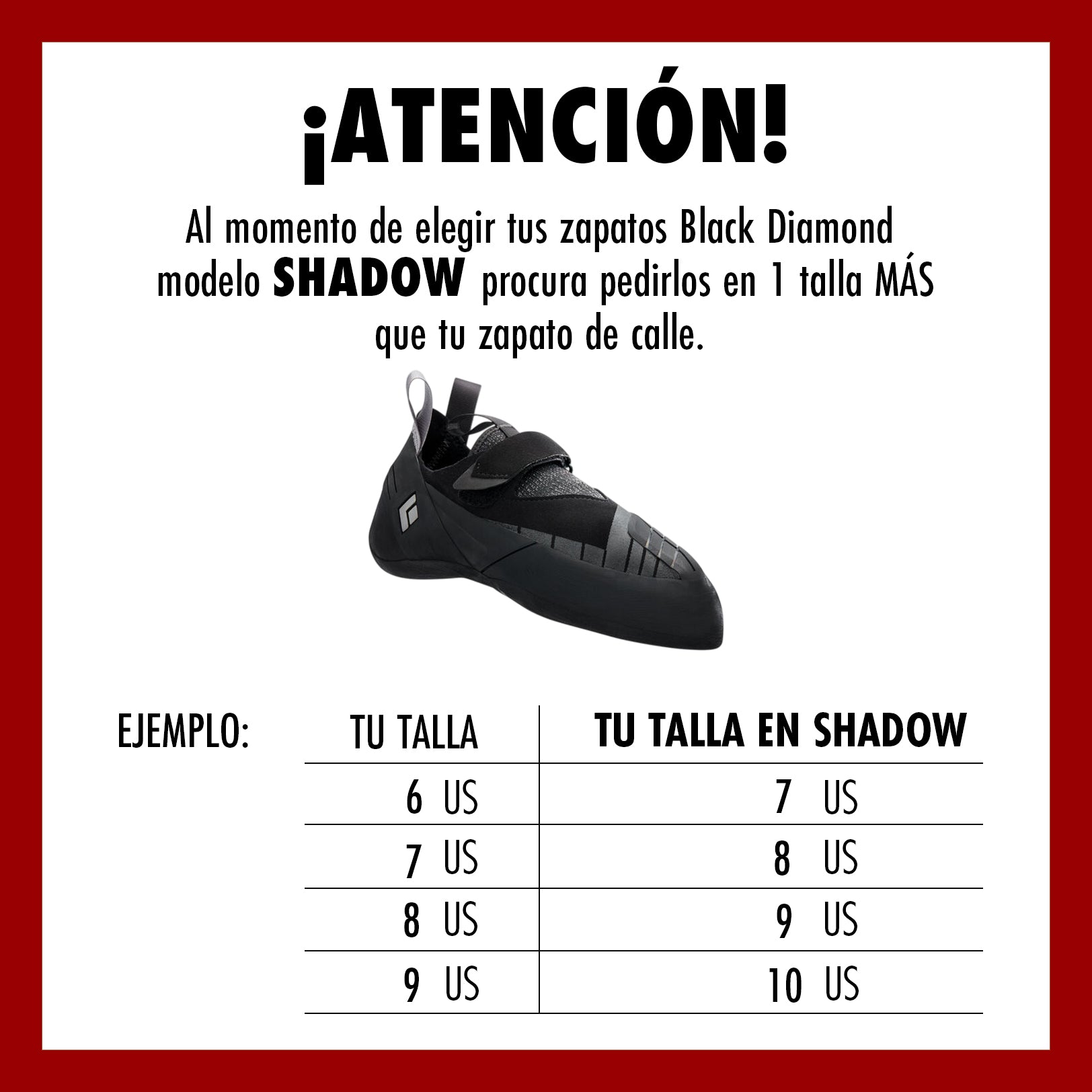 Al momento de elegir tus zapatos Black Diamond modelo SHADOW procura pedirlos en 1 talla MÁS que tu zapato de calle.
